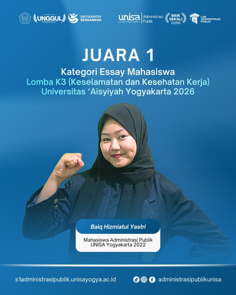 Prestasi ini menunjukkan kemampuan mahasiswa Administrasi Publik UNISA Yogyakarta tidak hanya unggul dalam bidang akademik, tetapi juga memiliki kompetensi praktis dan analitis yang relevan dengan isu keselamatan dan kesehatan kerja. Keberhasilan ini sekaligus menjadi bukti bahwa mahasiswa mampu berkontribusi dalam penguatan budaya K3 di lingkungan kampus.